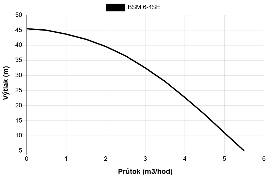 | BSM 6-4SE | 230 | 1.1 | 6.0 | Výtlak (m) | 45.5 | 45 | 43.7 | 42 | 39.6 | 36.5 | 32.5 | 28 | 22.7 | 17.1 | 11 | 5 |