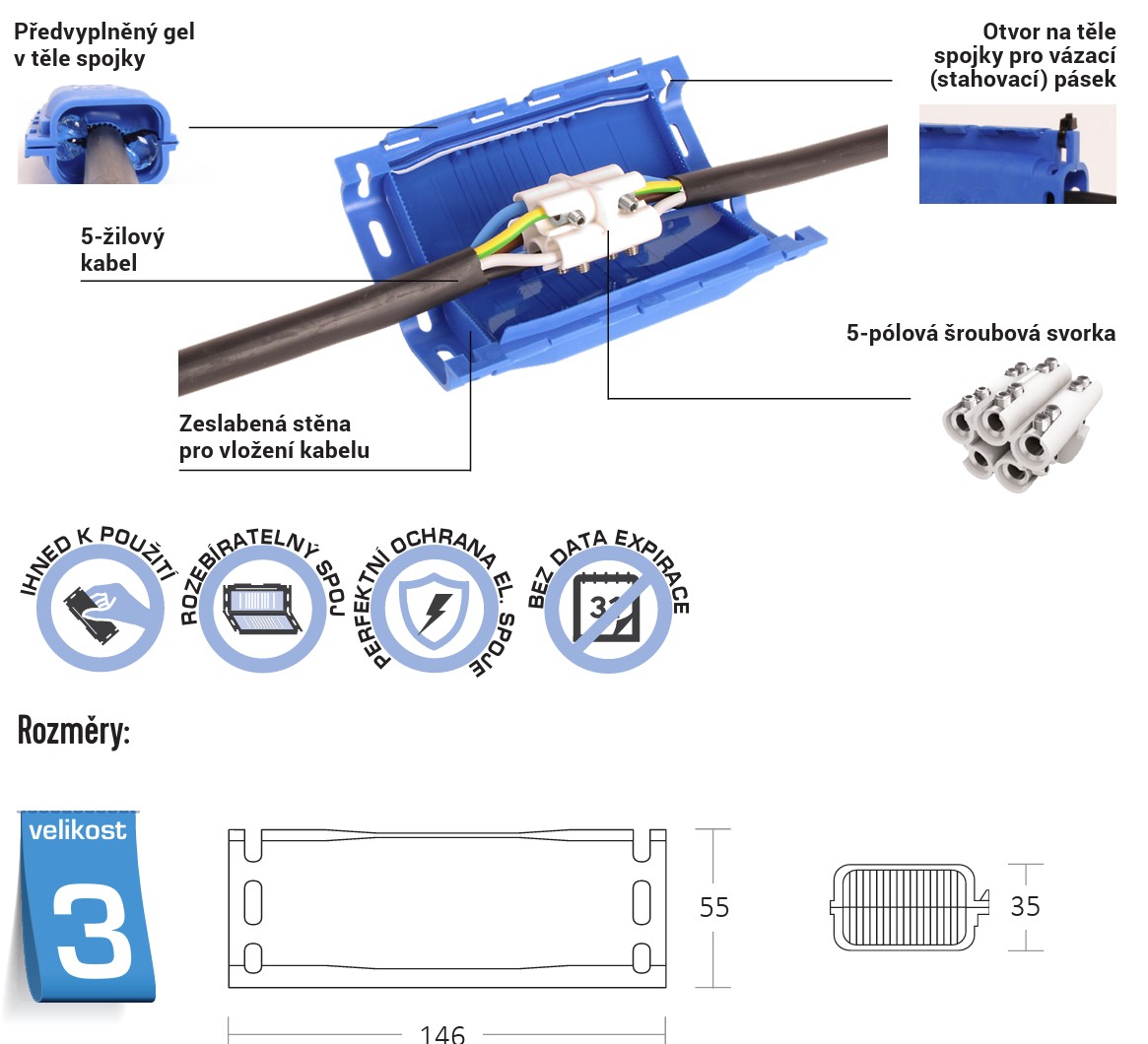 Pro spojování kabelů pod zemí, na vzduchu i v kanálových žlabech. Gelová hmota, která je předvyplněna z výroby, zajistí spolehlivé přilnutí ke kabelu a svorce. Vlhkost, voda ani žádné další nečistoty se již nedostanou ke spoji.