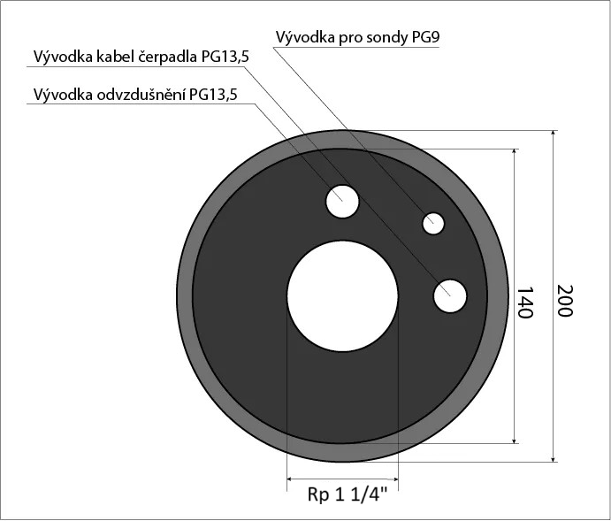 Instalační hlavice pro montáž ponorného čerpadla, určeno pro PVC pažení vrtu 140mm, přípojka pro čerpadlo 1 1/4". Verze s doplňkovou vývodkou PG9 pro kabel ponorných sond