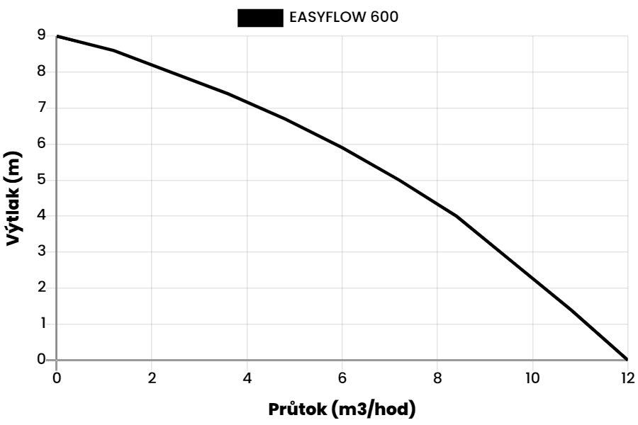 | EASYFLOW 600 | 0.6 | 230 | 2.5 | H (m) = | 9 | 8.6 | 8 | 7.4 | 6.7 | 5.9 | 5 | 4 | 2.7 | 1.4 | 0 |