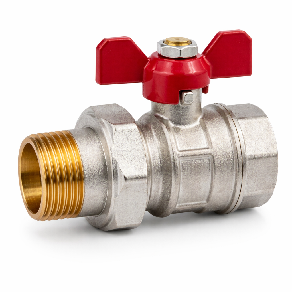 Kulovýá kohout s motýlkem a šroubením. Ideální pro instalaci filrů a dalších prvků, které je nutné uzavírat a mít možnost snadného odpojení