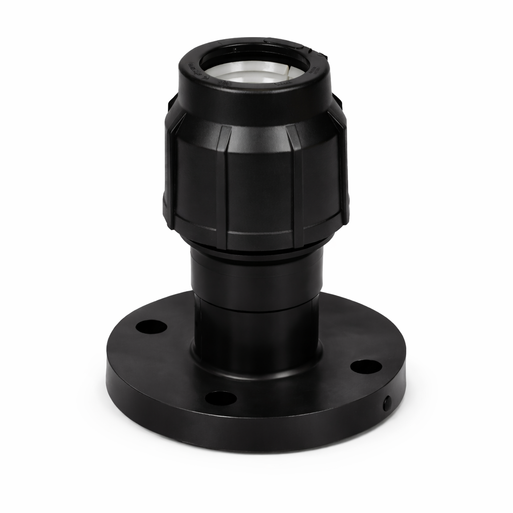 Přechodová tvarovka pro napojení PE potrubí d63 mm na přírubové připojení DN65. Určena pro tlakové rozvody vody do PN16. Vhodná pro připojení armatur, čerpadel a dalších přírubových prvků. Zajišťuje pevné a těsné spojení.