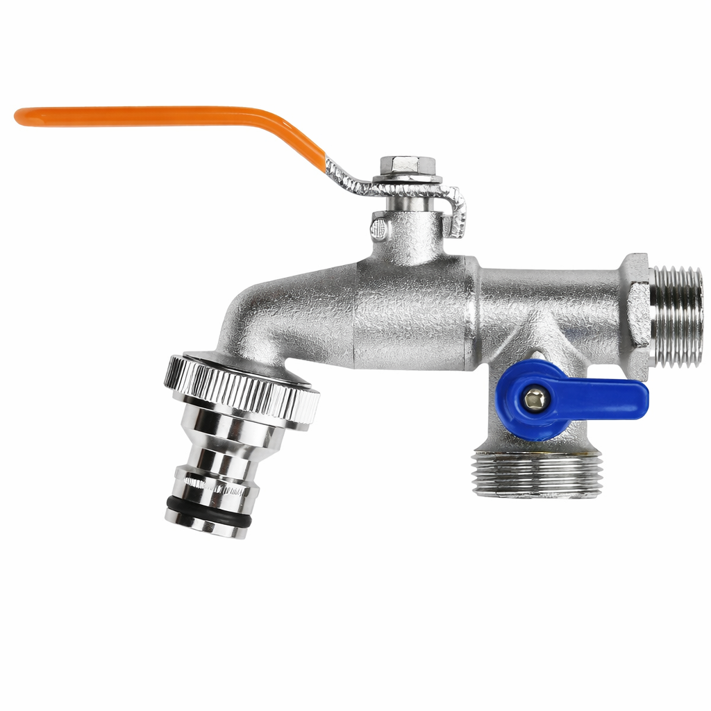 Zahradní kohout 1/2" s přípojkou na rychlospojku a přídavným výstupem 3/4" s vnějším závitem.